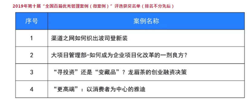 “全国百篇优秀管理案例”是中国管理案例评选的最高奖项,被誉为全国管理案例教学界“奥斯卡”。自2010年起,每年举办一届“全国百篇优秀管理案例”评选活动,入选的案例质量要求与国际接轨,并与毅伟商学院案例库合作面向全球发行。其承办单位中国管理案例共享中心是2007年5月在全国工商管理专业学位研究生教育指导委员会的支持下成立的服务性和非盈利合作机构,致力于开发中国本土原创高质量案例,推动和提高中国管理案例教学与研究水平。
