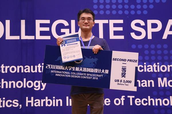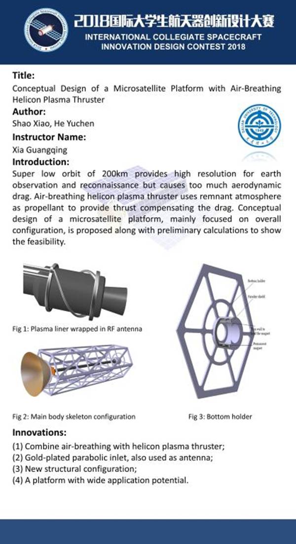 2018年8月11日至12日,2018国际大学生航天器创新设计大赛在哈尔滨工业大学举办,来自俄罗斯、巴基斯坦、阿尔及利亚等国家32所高校及科研单位、47支队伍入围最终总决赛。经过激烈角逐,共评选出一等奖3件(奖金$10,000税前),二等奖10件(奖金$3,000税前),优胜奖若干。特别优秀作品可入选中俄工科大学联盟——阿斯图小卫星任务方案,并协调提供搭载发射机会。我校运载工程与力学学部航空航天学院邵校、何钰琛两名本科生组成Space DLUT代表队参赛,其作品Conceptual Design of a Microsatellite Platform with Air-Breathing Helicon Plasma Thruster斩获二等奖。